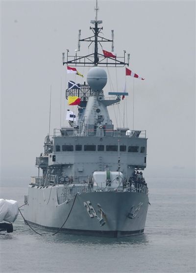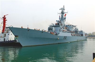 中国导弹护卫舰烟台舰满载排水量4000余吨,舰长134.1米,舰宽16米,是我国自主设计、研制的新型导弹护卫舰。