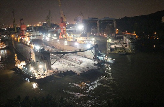 据网友发布的图片显示,2014年4月27日黄埔船厂下水了一艘我国自行研制的双体船。从图片上可以看出,该船涂装海军灰色涂装。船体无舷号。下水照片可以清晰看见该船双体结构……