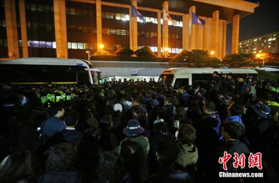 当地时间2014年5月9日凌晨,“岁月号”沉船事故遇难者遗属欲前往总统府青瓦台同朴槿惠总统会面,但在青瓦台附近遭到警方阻拦,双方通宵对峙。图片来源:CFP视觉中国