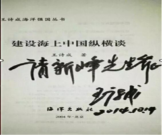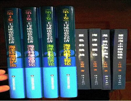 王诗成先生赠与李新峰主任《王诗成论蓝色经济》之海洋战略工程论、区域经济论、科学管理论、环境保护论,《蓝色的挑战》、《海洋战国论》等著作,并题词“请新峰先生斧正”。