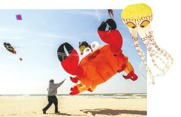 海洋财富网综合消息 近日,法国国际风筝节在法国北部城市贝尔克举行,该节日从4月18日~26日,为期9天。在风筝节上,人们放飞形状各异、色彩缤纷的风筝,图为飘荡在天空的巨大螃蟹和水母风筝。