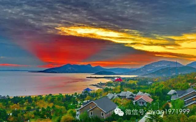 浓烈的光影下波涛翻滚着、激荡着,回旋着,竟似聚合成一湾熔熔灼热的金汤,海边红石崖如腾起了轻烟紫雾,西乳山极顶“神女峰”又像是戴上了灿灿的霞冠,连山晚照的幻彩顿时绘就满天云锦,丝丝缕缕,条条块块,紫红相间,绚烂至极。