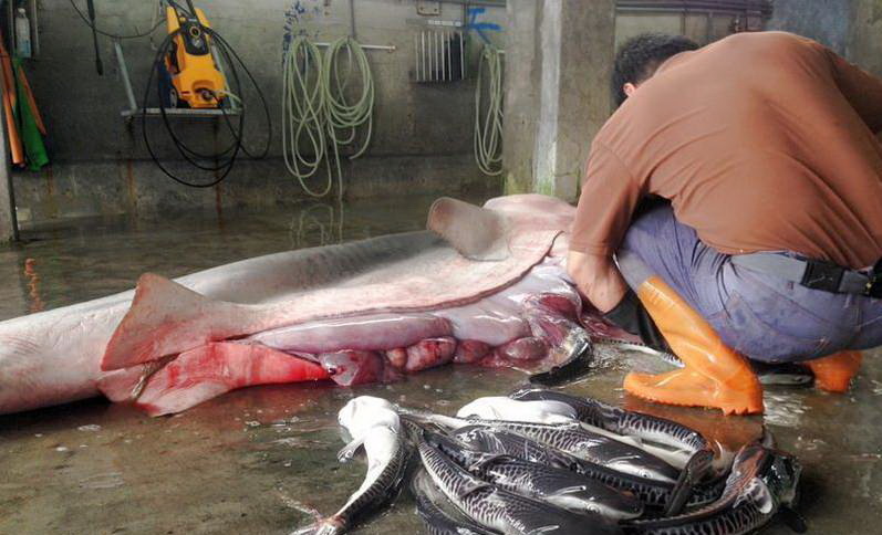 渔民捕获1尾母虎鲨,长370公分、重约200公斤,渔民直觉“应该快生产了”,于是细心的照顾母虎鲨,不让它受到撞击。渔民轻轻的将母鲨的腹部割开,立即蹦出小鲨,幼鲨眼睛大大的,相当可爱,取出小鲨后,赶紧送到水试所东部海洋生物研究中心。图为幼鲨。