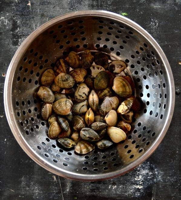 4.加入洗好的蛤蜊。倒入黄酒,盖上锅盖