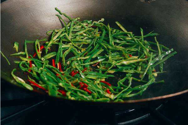 4.翻炒10秒,加入切好的姜和蒜、辣椒等