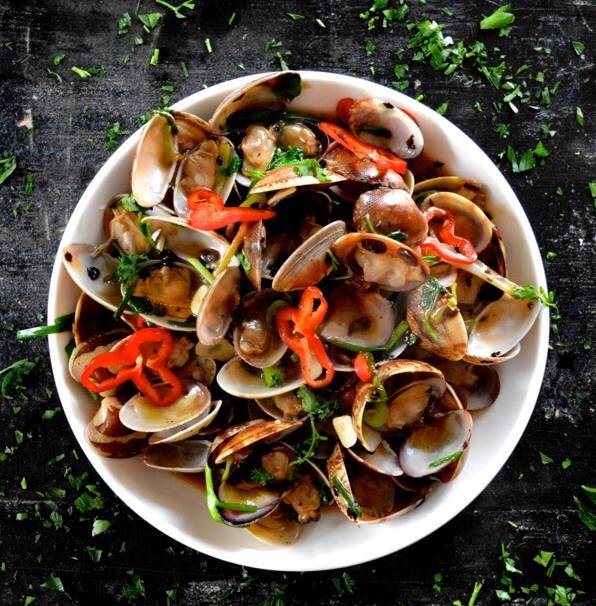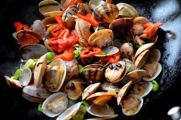 蛤蜊,食用油,姜,大蒜,葱,青、红辣椒,豆瓣酱,黄酒,糖,白胡椒,酱油,盐,玉米淀粉