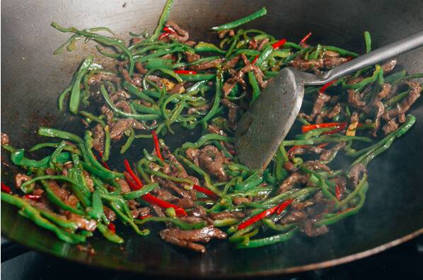 4.放入牛肉,加入盐、糖、酱油和胡椒粉,勾兑进去适量的玉米淀粉,翻炒至辣椒变暗即可。