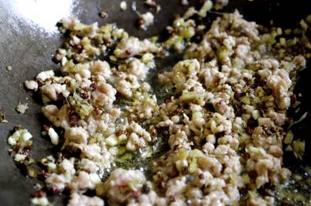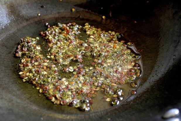 5.锅中加油,油热时放入切好的姜片、辣椒和葱段,放入花椒,进行翻炒