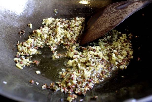 3.加油热锅,放入切好的大蒜和辣椒,炒香