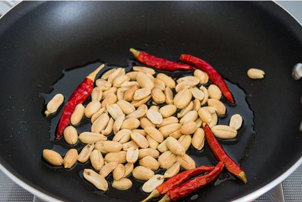 2.锅中放两勺油,油热时,放入干辣椒和花生,炒香,盛出待用。