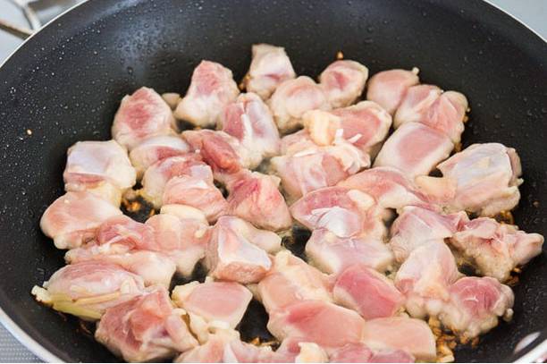 3.锅中放油,油热时放入切好的姜和大蒜,翻炒,放入腌制好的鸡块。