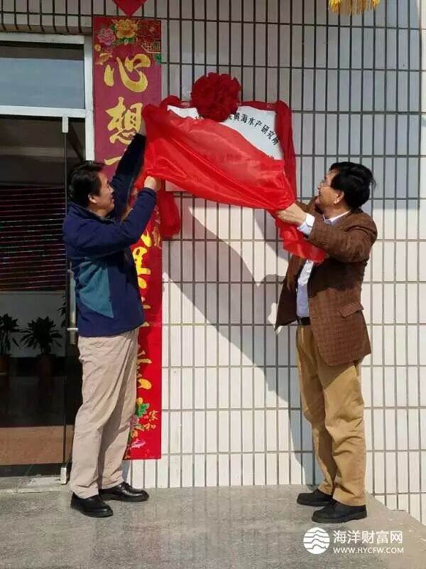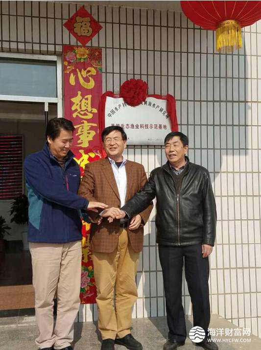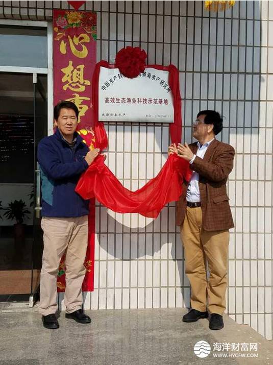 海洋财富网记者王玮在威海报道, "中国水科院黄海水产研究所一一高效生态渔业科技示范基地"揭牌仪式在威海瑜泰水产发展有限公司举行。出席揭牌仪式的领导专家是:山东省企业家俱乐部常务副主席、 省海洋与渔业厅原巡视员、国家蓝色经济专家王诗成研究员、中国水科院黄海北产研究所成果转化处处长、水产养殖疾病防控专家王印庚研究员、鱼类繁殖专家刘新富高级工程师、海水养殖专家陈贵平工程师、山东海洋网络科技有限公司总裁、海洋财富网CEO王玮、威海市海洋与渔业局梁延松副调研员、威海瑜泰水产发展有限公司林占德副总裁参加了揭牌仪。王诗成研究员和王印庚研究员为科企合作基地揭牌。