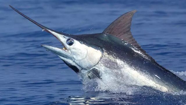 NO.1蓝枪鱼 生活在大西洋海域,它可能是这片海域的所有物种中最出名的鱼类。它们中的几个已囊括了全世界范围内所有的长嘴鱼品种。马林鱼有着可以刺穿猎物的尖长嘴,背鳍壮硕有力,前行时状如船帆。它们与鳟鱼是近亲,曾经也活跃于淡水域或江河入海口中。蓝枪鱼和体积更大的黑枪鱼可能是目前长嘴鱼族群中最庞大的两大家族。成年蓝枪鱼长度可达7英尺,体重可达260磅。