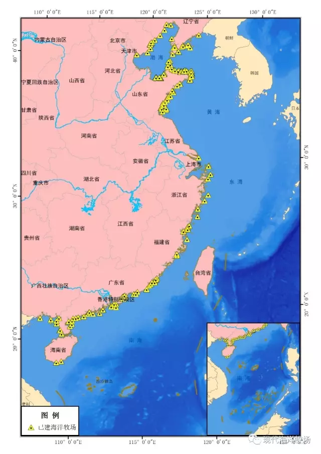 附图1:全国海洋牧场建设情况分布图(截止到2015年)
