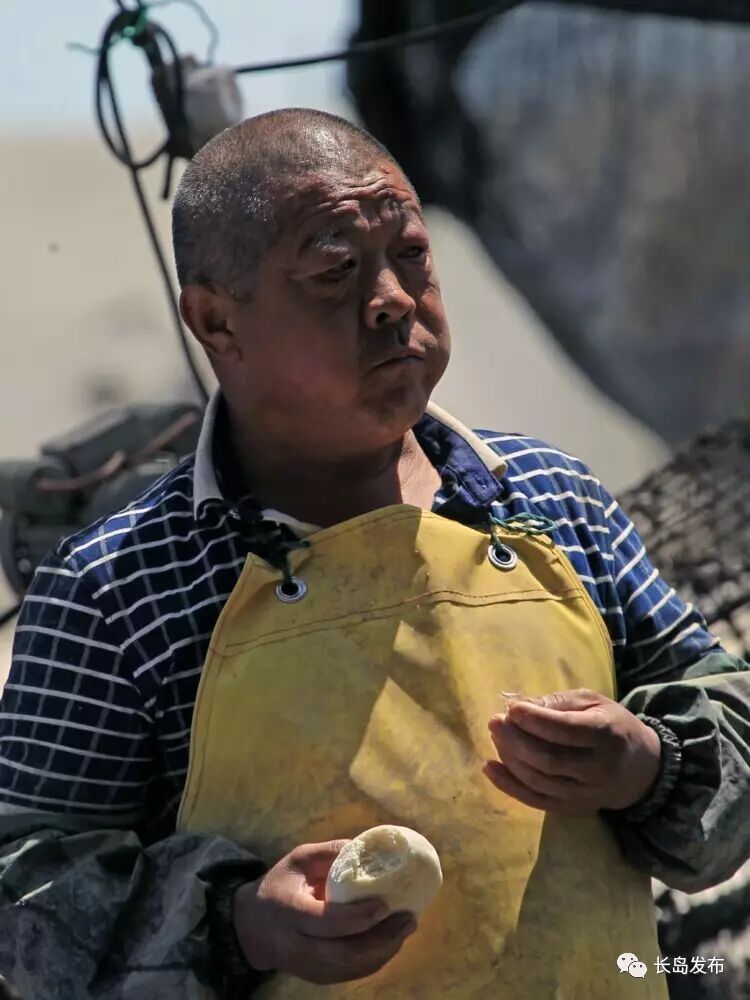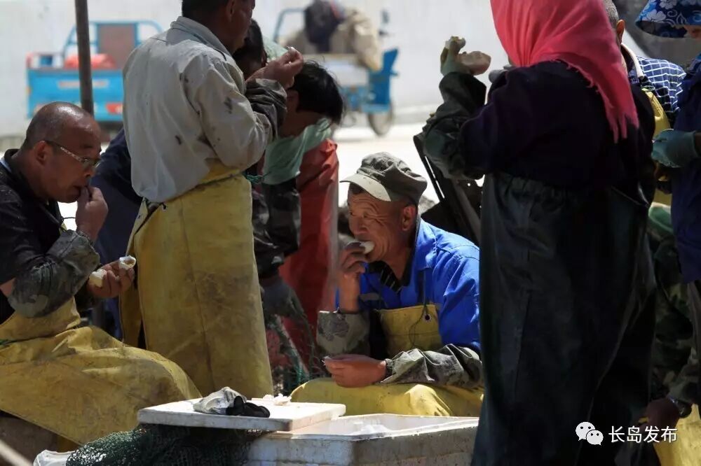 渔民们几乎没有多少休息时间更别说吃饭了,到了中午他们拿出自带的饭菜,就着咸咸的海风,一顿饭就这么对付过去了,吃饱了便继续干活。