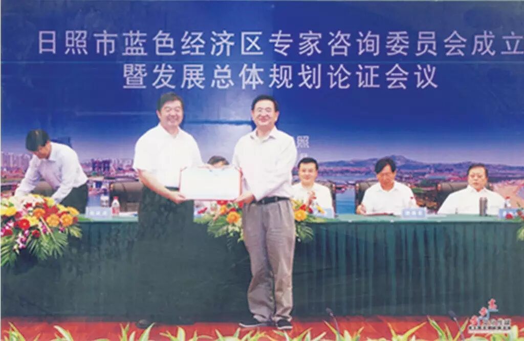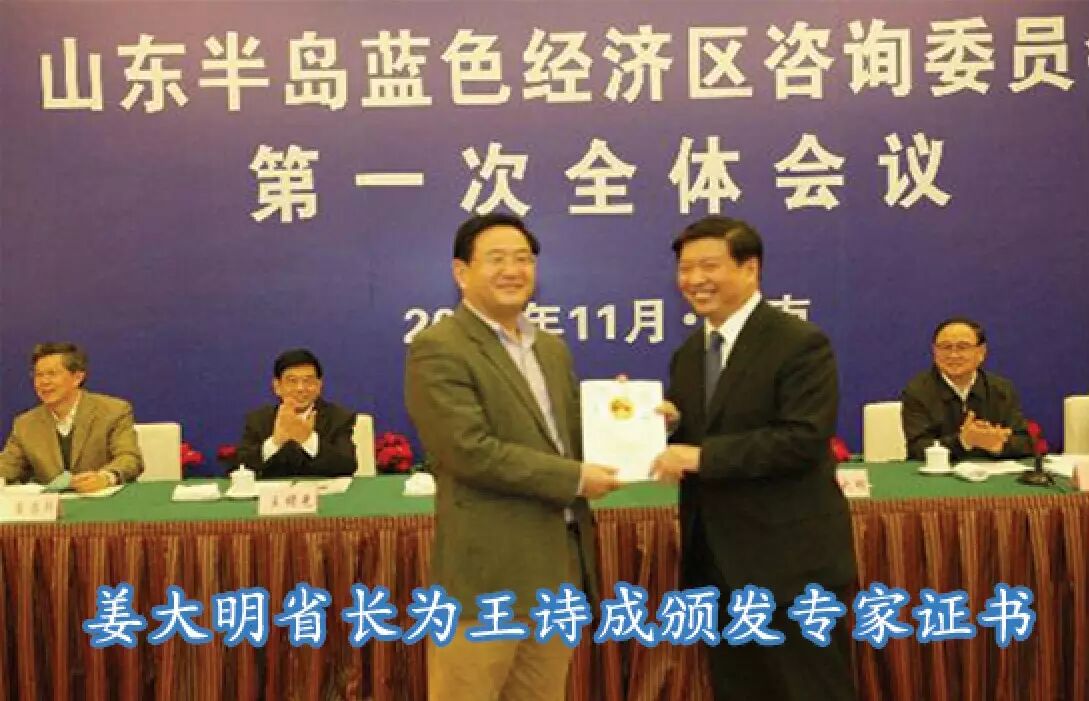 没有一个以海洋经济为主导的国家层面的海洋战略,省委、省政府自91年提出海上山东建设跨世纪工程以来,经过18 年的打造,山东已把海洋区位、资源、科技和基础设施优势变成海洋产业和经济发展优势,山东已成为全国发展海洋经济的领头羊,山东省委、省政府完全有条件有能力做到把海洋强省战略提推上国家层面的海洋发展战略,这对于国家、对于山东省来说具有里程碑意义……”。王诗成把藏在心里十多年想说又没有机会当面对省领导说的话一古脑倒了出来。建议得到省领导的认可,产生了共鸣,座谈会结束后姜书记握着王诗成的手,特别交待让秘书把他多年来的研究成果(著作和主要论文)送给他,并尽快出版“论蓝色经济丛书”。在座谈会之后不到两个月的2009年4月9日,胡锦涛总书记在山东济南作出“大力发展海洋经济,科学利用海洋资源,培育海洋优势产业,打造山东半岛蓝色经济区”的重要讲话,总书记讲话一锤定音,全国第一个以海洋经济为主导的国家战略问世,山东成立了书记挂帅的领导小组、省长掌任的推进小组、聘任国家级专家组建咨询委员会,时任分管副厅长的王诗成被省委、省政府聘为国家半岛蓝色经济区咨询专家。在短短的半年的时间里,国务院就正式批复了 “山东半岛蓝色经济区建设规划”。喜悦之后的王诗成深知建设蓝色经济区意义重大,任重道远,他不做挂名专家,更不愿人云亦云,他继续潜心研究,为蓝色经济区的健康科学发展献计献策。
