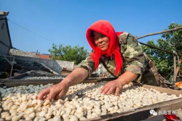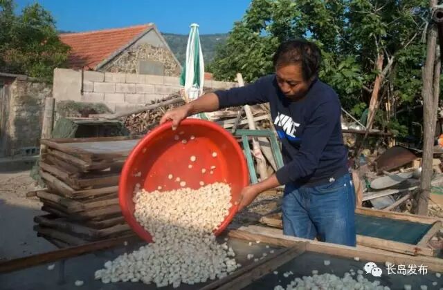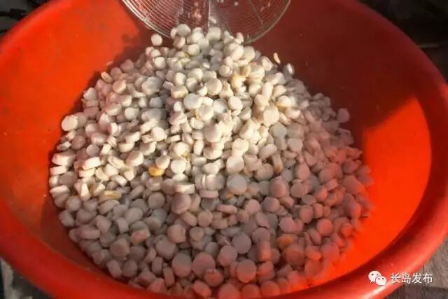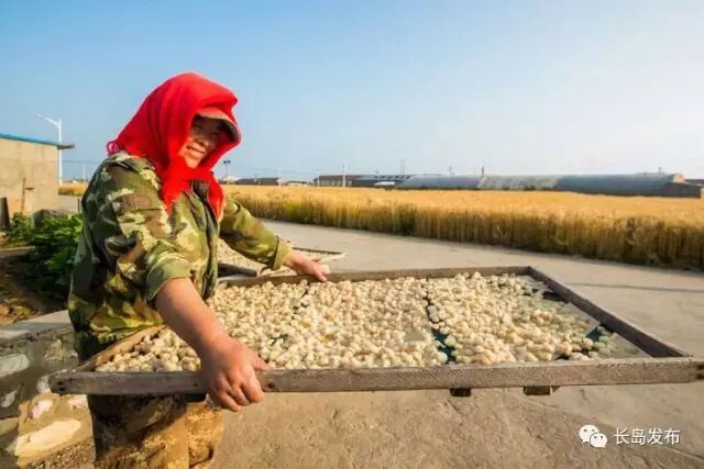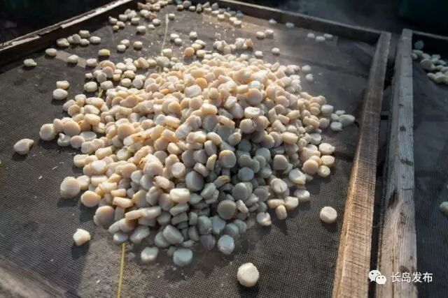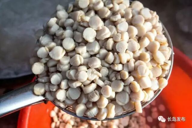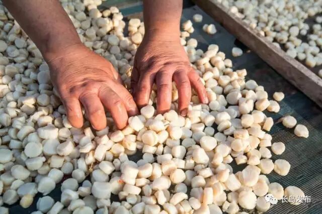 大量的扇贝连壳被运送到长岛出售,还有些勤劳的渔妇为了增加收入,也为了满足市场的需求,她们熟练地将生长期略长、个头较大的扇贝剥出雪白的肉丁,再加工制成干贝丁供消费市场。