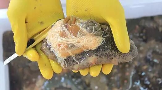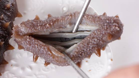 抛开海参腹部后,海参内壁有几条白色内筋,就是我们俗称的海参筋。很多人烹制海参时都会除去海参肚子上白色的筋,他们认为这多半是海参的血管或海参的消化肠道,不是很干净,其实海参筋完全能吃,而且还有很高的营养价值。