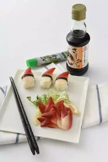 3. 将寿司饭捏成上小下大的长形小饭团,涂上少许芥末,将切片好的北极贝覆盖在饭团上(可将海苔剪成细条给你的寿司加条“腰带”)。
