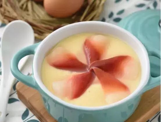 3. 在鸡蛋羹上铺上切好片的北极贝,约30秒后关火。