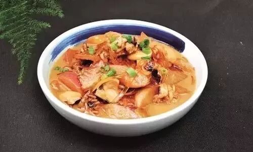 这道菜以春季的水萝卜为主料,以小墨鱼和红薯粉条为辅料,经过长时间的加热后,墨鱼的鲜味被萝卜和粉条充份吸收。