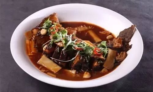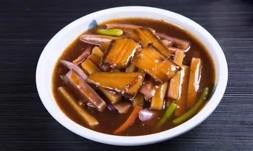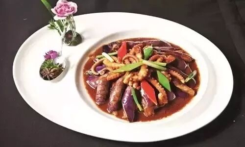 八带搭配山茄一起烧制,成菜带有浓郁的酱香味。