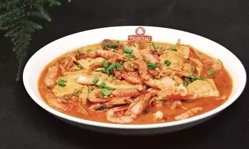 这道熬菜用到了三种海鲜原料,分别是沥虾、八带和海肠,搭配老豆腐长时间加热,成菜鲜香味浓郁。
