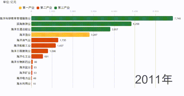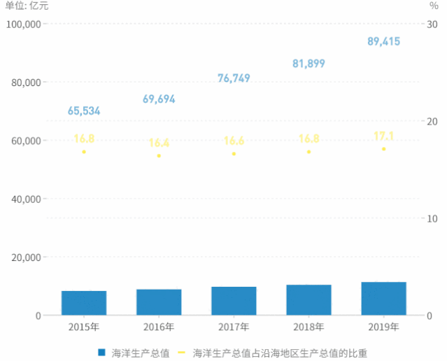 最近五年海洋三次产业增加值 占海洋生产总值的比重 二 主要海洋产业发展情况 2019年,我国主要海洋产业保持稳步增长,全年实现增加值35724亿元,比上年增长7.5%。滨海旅游业、海洋交通运输业和海洋渔业作为海洋经济发展的支柱产业,其增加值占主要海洋产业增加值的比重分别为50.6%、18.0%和13.2%。 2019年主要海洋产业增加值构成图 海洋新兴产业发展情况 主要海洋产业发展情况如下: 海洋渔业 海洋渔业实现恢复性增长,养捕结构持续优化。全年实现增加值4715亿元,比上年增长4.4%。 海洋油气业 海洋油气增储上产态势良好,其中海洋原油生产增速由负转正,扭转了2016年以来产量连续下滑的态势,实现产量4916万吨,比上年增长2.3%;海洋天然气产量持续增长,达到162亿立方米,比上年增长5.4%。海洋油气业全年实现增加值1541亿元,比上年增长4.7%。 蓝鲸2号 海洋矿业 海洋盐业 海洋盐业保持稳定,全年实现增加值31亿元,比上年增长0.2%。 海洋化工业 海洋化工业较快发展,乙烯、纯碱等海洋化工产品产量快速增长。全年实现增加值1157亿元,比上年增长7.3%。 海洋生物医药业 海洋生物医药自主研发成果不断涌现,产业平稳较快增长。全年实现增加值443亿元,比上年增长8.0%。 海洋电力业 海洋电力业稳步发展,海上风电装机规模逐步扩大。全年实现增加值199亿元,比上年增长7.2%。 2019年8月26日LHD项目发电并网三周年,截至2020年4月,累计发电并网 1763397.7千瓦时。 半潜式波浪能养殖旅游平台“澎湖号”侧视图 半潜式波浪能养殖旅游平台“澎湖号”工作状态 海水利用业 海水利用业保持良好发展,多个海水淡化工程投入使用。全年实现增加值18亿元,比上年增长7.4%。 海洋船舶工业 海洋船舶工业止降回升并实现较快增长,重点监测的规模以上海洋船舶企业营业收入比上年增长13.5%。全年实现增加值1182亿元,比上年增长11.3%。 海洋工程建筑业 海洋工程建筑业发展向好,跨海大桥、海底隧道等多项重大海洋工程建筑项目顺利完工。全年实现增加值1732亿元,比上年增加4.5%。 南沙大桥 海洋交通运输业 海洋交通运输业运行平稳,海洋货运量比上年增长8.4%,沿海港口生产保持稳步增长态势。全年实现增加值6427亿元,比上年增长5.8%。 辽宁 营口 滨海旅游业 滨海旅游业持续较快增长,发展模式呈现生态化和多元化。全年实现增加值18086亿元,比上年增长9.3%。 鼓浪屿 三 区域海洋经济发展情况 2019年,北部海洋经济圈海洋生产总值26360亿元,比上年名义增长8.1%,占全国海洋生产总值的比重为29.5%;东部海洋经济圈海洋生产总值26570亿元,比上年名义增长8.6%,占全国海洋生产总值的比重为29.7%;南部海洋经济圈海洋生产总值36486亿元,比上年名义增长10.4%,占全国海洋生产总值的比重为40.8%。 最近五年区域海洋生产总值变化 注释: 数据说明 [1] 本公报中2019年数据为初步核算数,2018年及之前数据为核实数。各项统计数据来自沿海地区自然资源(海洋)、统计主管部门和国务院有关部门。部分数据因四舍五入的原因,存在着总计与分项合计不等的情况。 [2] 海洋生产总值增长速度、各海洋产业增加值增长速度按可比价格计算。海洋生产总值、三次产业增加值、各海洋产业增加值、各海洋经济圈海洋生产总值及增长速度、各比重数据按现价计算。 [3] 本公报统计区域范围为沿海地区。依据《沿海行政区域分类与代码》(HY/T 094-2006),沿海地区指有海岸线(大陆岸线和岛屿岸线)的省(自治区、直辖市),包括辽宁省、河北省、天津市、山东省、江苏省、上海市、浙江省、福建省、广东省、广西壮族自治区和海南省,未包括香港特别行政区、澳门特别行政区和台湾省。依据《全国海洋经济发展“十三五”规划》,北部海洋经济圈指由辽东半岛、渤海湾和山东半岛沿岸地区所组成的经济区域,主要包括辽宁省、河北省、天津市和山东省的海域与陆域;东部海洋经济圈指由长江三角洲的沿岸地区所组成的经济区域,主要包括江苏省、上海市和浙江省的海域与陆域;南部海洋经济圈指由福建、珠江口及其两翼、北部湾、海南岛沿岸地区所组成的经济区域,主要包括福建省、广东省、广西壮族自治区和海南省的海域与陆域。