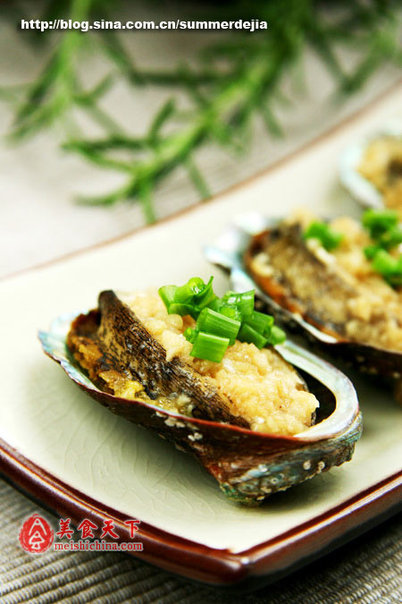 3、蒜蓉用热油烫一下,加入盐、美极鲜、鸡精、糖,将鲍肉放入鲍壳中,浇上汁,锅中水开后放入锅中,大火蒸七八分钟即可。
