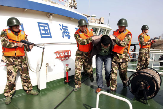 海洋财富网综合消息 3月16日,江苏海警三大队在连云港海域举行“处置海上恐怖事件”实弹演练,演练以一伙持枪恐怖分子劫持渔船,伺机前往上海海域破坏世博会为背景展开,内容包括海上巡逻、高速追击、枪弹射击、海上搜捕等,以检验和提高海警官兵的反恐作战能力。(王健民 摄)