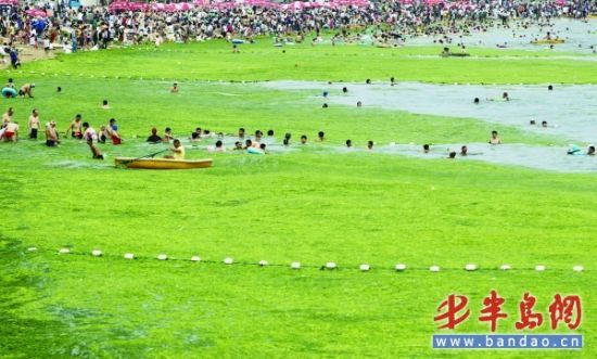 大量浒苔登陆青岛海水浴场 游客被逼上岸